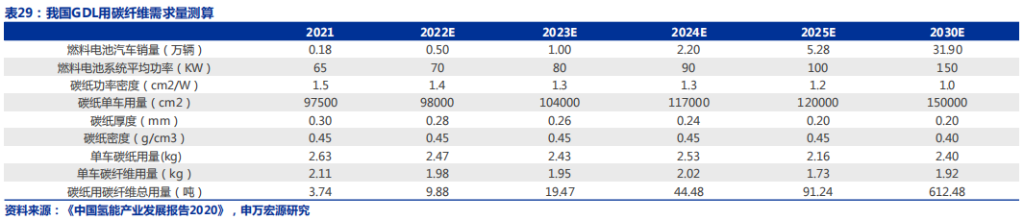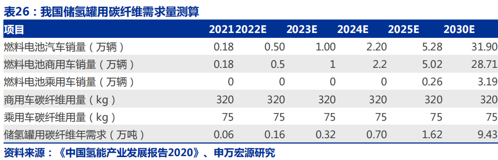 碳纤维是储氢罐最为主要的材料,据美国DOE数据,储氢罐成本占比超过50%,乘用车储氢罐单车用量为75kg,商用车储氢罐单车用量为320kg,结 合《中 国 氢 能 产 业 发 展 报 告2020》,2025/2030氢 燃 料电 池 汽 车10/100万辆的规划,我们测算得出2025/2030年我国储氢罐用碳纤维需求量可达1.62/9.43万吨。据《2020全球碳纤维复合材料市场报告》,全球范围内压力容器碳纤维需求2025/2030年可达2.19/18万吨。