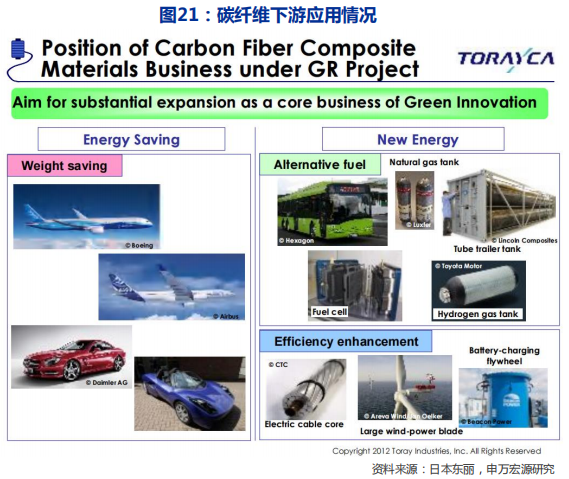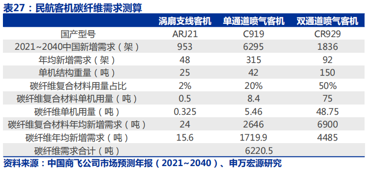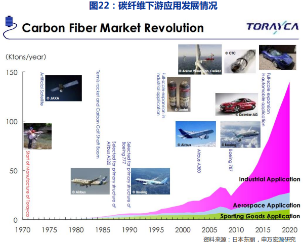 尽管如此,我们并不怀疑未来行业需求的空间,我们认为随着中国碳纤维生产能力与成本的赶超,叠加上下游产业链配套(主要是复合材料创新工艺与成本下降),碳纤维行业下游需求有望加速扩张。
