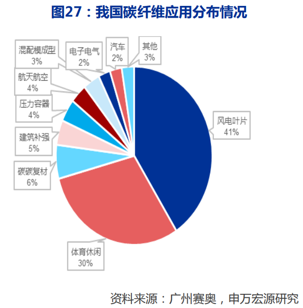 从应用结构来看,2020年我国碳纤维主要用于风电和体育休闲领域,航空航天在我国占比较少。具体而言,风电叶片应用最大,在我国应用占比41%,需求量为20000吨,但这一领域所用的碳纤维大都是进口产品,客户也基本上是国外公司;其次是体育休闲,占比为30%,需求量为14600吨;航空航天在我国的应用仅为1700吨,占比为3.5%