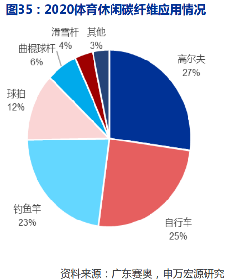 我国体育休闲行业碳纤维需求量大,且产品以小丝束为主,高尔夫球杆、自行车和钓鱼竿为主要应用方向。全球近90%的碳纤维体育器材加工在中国大陆和中国台湾完成,2020年国内体育用品领域碳纤维需求量为1.55万 吨,占国内需求总量的30%,较2019年增长4%。体育休闲领域产品类别广泛,对碳纤维的需求呈现高低端并存的局面,国内需求主要以T300级、 T700级为主,包括少量 T800 级和高模量产品。规格以 3K、12K 等小丝束为主,需求种类较多。